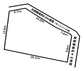 | 接道状況 | 東側幅員約4m道路 北側幅員約2.5m道路(セットバック済) |