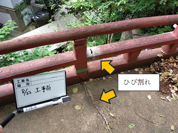 マンションの敷地内にある太鼓橋にひび割れが目立ち、安全に使用できるように補強をしたいとの依頼を受けました。